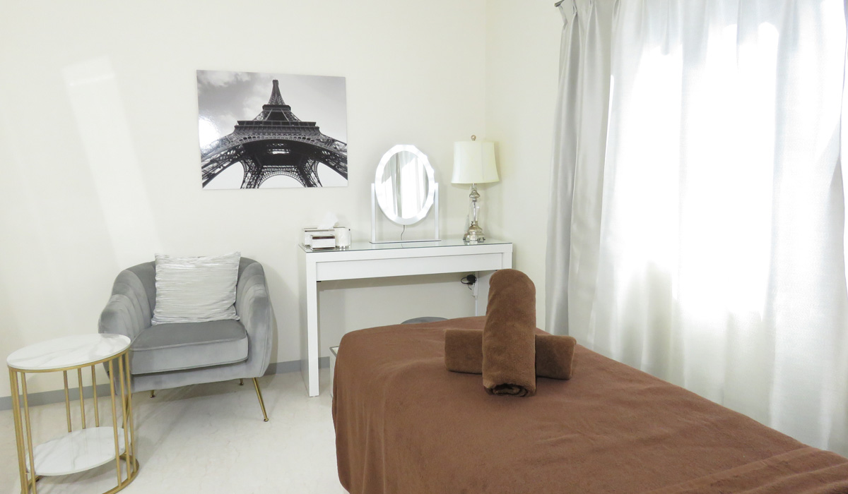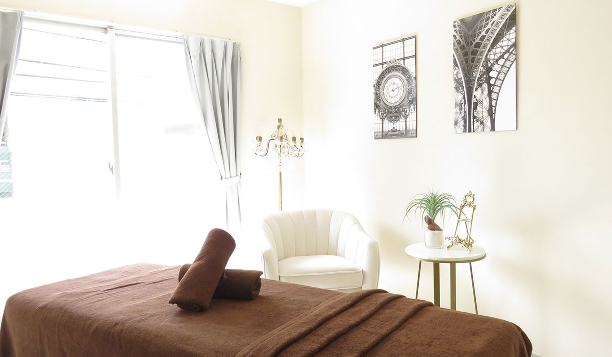 施術ルームはベージュ・薄ピンクを基調とした暖かみのある落ち着いた雰囲気で、完全個室・シャワー・パウダールームも完備しています。